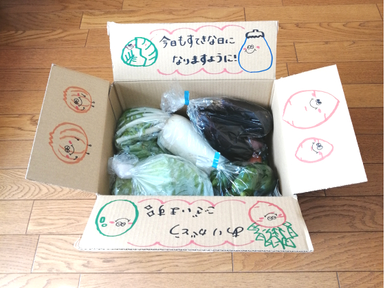 今回野菜セットをお願いした「いわいわファーム」はダンボールに描かれた可愛いイラストとメッセージが癒し!ひとつひとつが立派でおいしい野菜を届けてくれます。